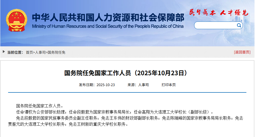 每经AI快讯,据东谈主社部网站音尘,10月23日,国务院任免国度使命主谈主员。